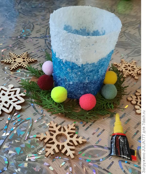 Сразу обсыпаем (обваливаем) крупной солью. Ставим сохнуть. Из картона вырезаем круг диаметром чуть больше дна стакана. В середину на клей «Момент» клеим стакан. Кисточкой с синей краской окрашиваем нижнюю треть стакана.