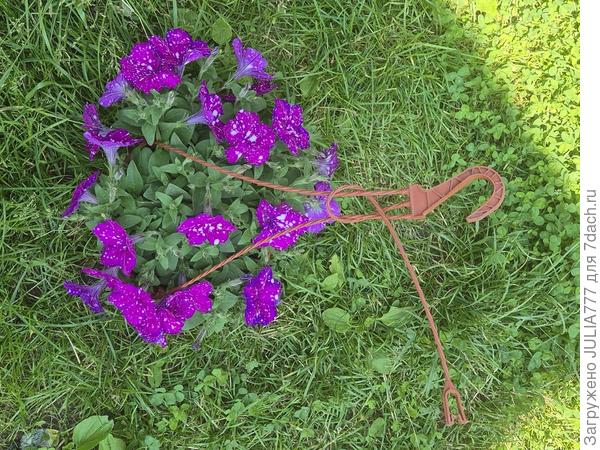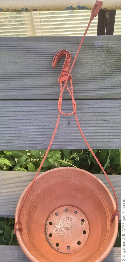 Если вы тоже любитель цветов в подвесных кашпо — ловите небольшой совет. Отцепляем один любой держатель от горшка, оборачиваем под крючком петлёй и вставляем на свое место.