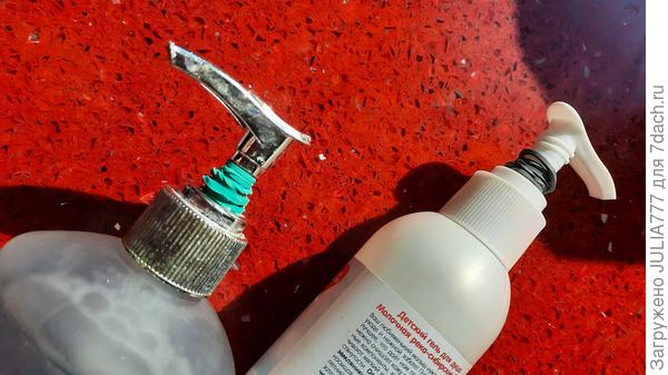 Если при нажатии сразу выскакивает большой объём средства — то это не очень экономно. А временами ещё и мимо рук (мочалки) бьёт далеко струя геля. Тогда ещё и убирать-смывать приходится лишнее с раковины и полочки. Если такое случается, можно на трубочку под дозатором намотать канцелярскую резинку в несколько оборотов. Тогда, даже если кто-то сильно нажмёт в спешке — ничего не случится.