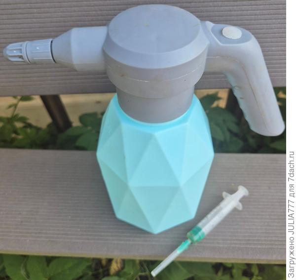 Мне обычно не нужно сразу 5 л готового раствора для опрыскивания. Увидела на любимой розочке немного тли, взяла пол-литра воды, добавила 0,5 мл «Фуфанон» из шприца, и побрызгала.