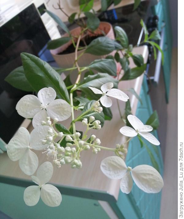Я в этом году приобрела карликовый сорт метельчатой гортензии «Little Spooky» именно для балкона. Мало мне экспериментов с крупнолистными, так я ещё решила попробовать в этом году и с пильчатой гортензией, и с гибридной, и с метельчатой. Маловато (а то и вовсе нет) информации о содержании этих гортензий в помещении. Приходится самой этот опыт нарабатывать.