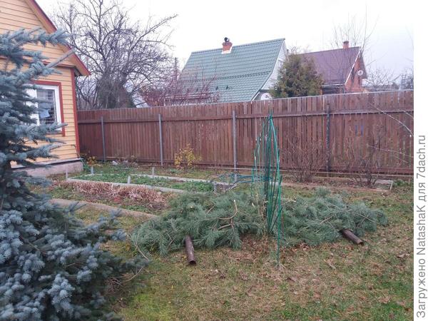 Я свои штамбы начинаю «уговаривать» склониться заранее. Подвешиваю на «шею» мешочек с камнем и постепенно подкладываю еще груз. Пока роза не согнется до высоты дуг, на которые потом накидываю 2 слоя лутрасила марки 60.