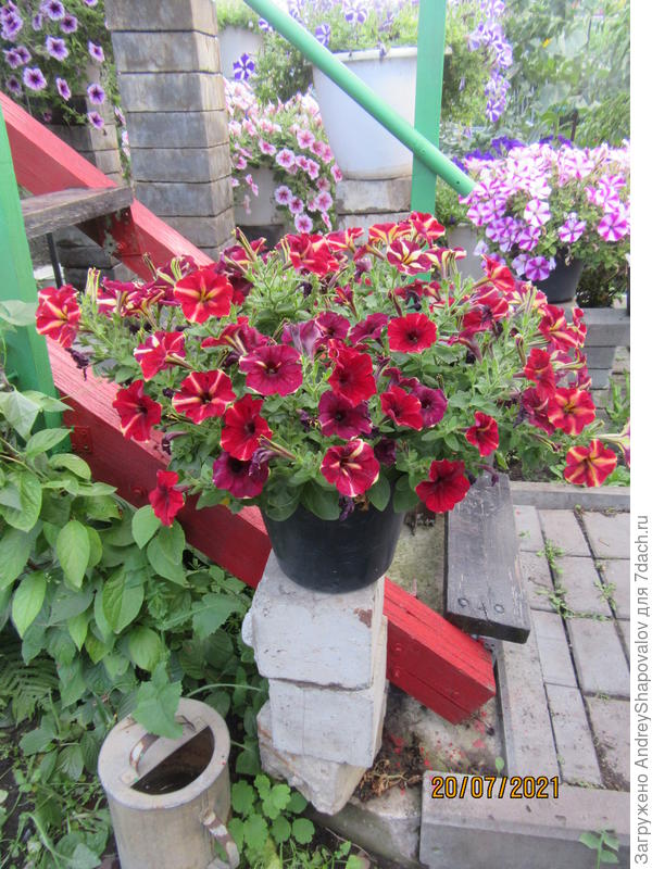 Опера, Рамблин и Тайдал – одни из самых мощных петуний (часто в названиях можно встретить такие определения, как суперкаскадные или гигантские), считаются «рабочими лошадками». Если им предоставить хороший объем (30-50 л), диаметр одного растения достигает 1,8-2,2 м (ниже на фото показываю Рамблина, который вымахал более 2 метров)