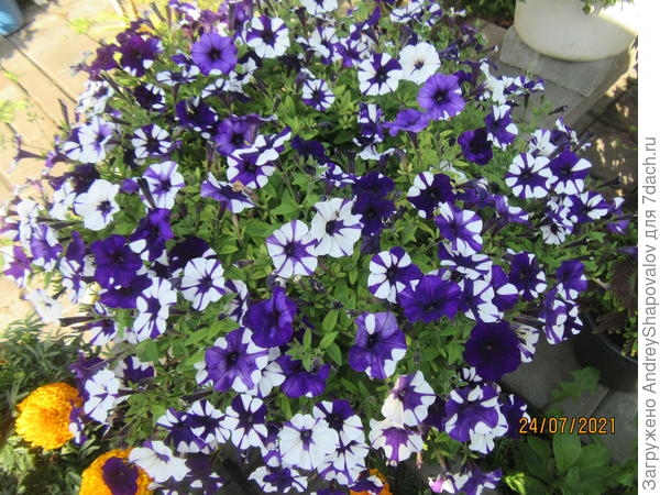 Кстати, на фото можно сравнить Тайдал и Торнадо, как выглядит петуния в 10 л (фото выше) и «на вольных хлебах», где около 30-50 л (ракурсы, правда, не совсем удачные). Но мне по душе аккуратные «шапочки», как у Джоконды мини (у нее еще и цветы стерильные, остается декоративной весь сезон, не требует стрижки)