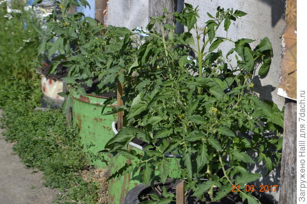А вот эти помидоры поливаю через два дня, потому что солнечная сторона и жесть, и баллоны сильно нагреваются, и листья начинают вянуть, а после полива сразу оживают.