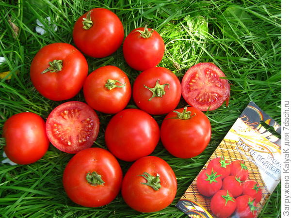 Размер плодов примерно одинаковый, в районе 100 г, оправдывает название. Куст низкий, для большей урожайности не нужно его пасынковать. Урожайность в моем случае маленькая, не более 1 кг. Из всех посаженных сортов он был самым ранним, первые плоды поспели в начале августа. Но все равно позже, чем заявлено на этикетке.