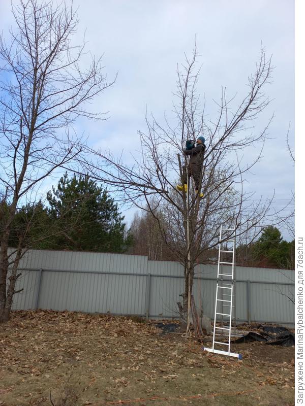 — ветка горизонтально выше забора приблизительно на 70 см… Посему им хватило обычной стремянки у забора и верёвки для страховки и оттяжки отломка… Пилили бензопилой…