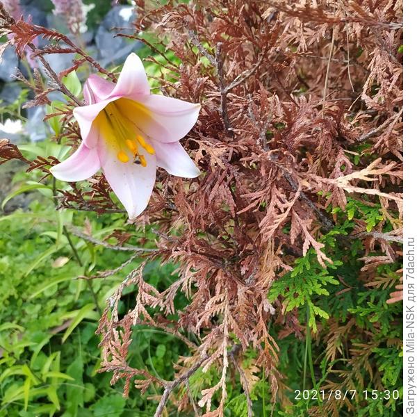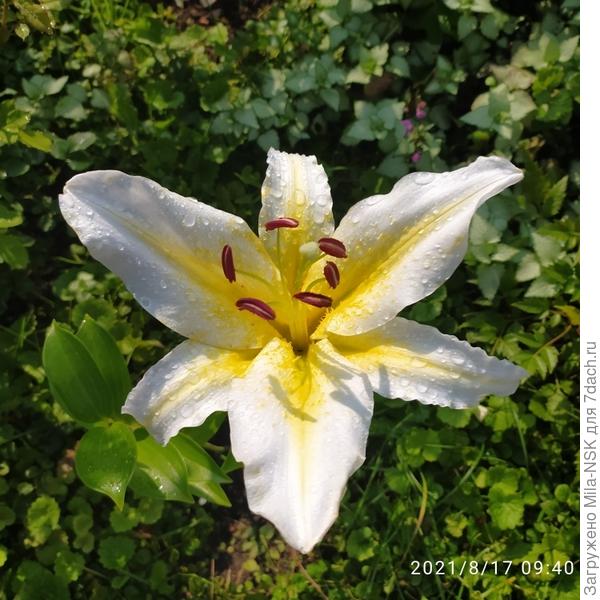 Несколько дней принюхивалась издалека. У меня же там буйные заросли — внутри клумбы… Потом решила пробраться и определить точно источник запаха. Оказалось -действительно, это она, моя восточная Лилия так нас радует!