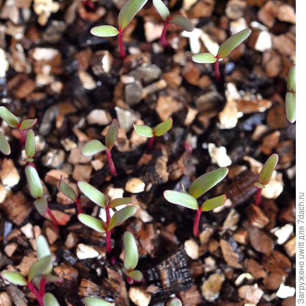 Проросшие, но не очень дружно, семена свеклы столовой. Снято на 10 день после посадки