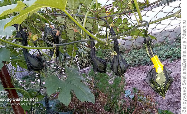 Тыква очень плетистая, формирует множество плодов. На одном растении формируется до 10 тыкв.