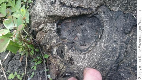 Да, выглядит действительно очень противно. Капли так вообще похожи на пропавшую кровь. Но, логически рассуждая, пришел к тому, что это может быть просто пропавший сок ореха, выделившийся наружу из-за давления (орех-то растет и расширяется довольно сильно), потому как соседние слои древесины давят на мертвые слои (место среза), а сырой срез потому, что находится у земли.