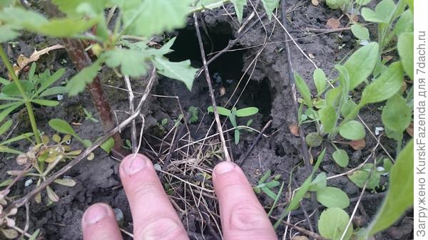 Ходы поверхностные, поднят самый верхний слой почвы. В ход можно всунуть 4 пальца (фото 1). Когда разрыл — понял, что, скорее всего, все же слепыш, ибо крот чуть мельче. Но внешне похоже на поверхностные ходы крота (уж обрадовался, что крот...