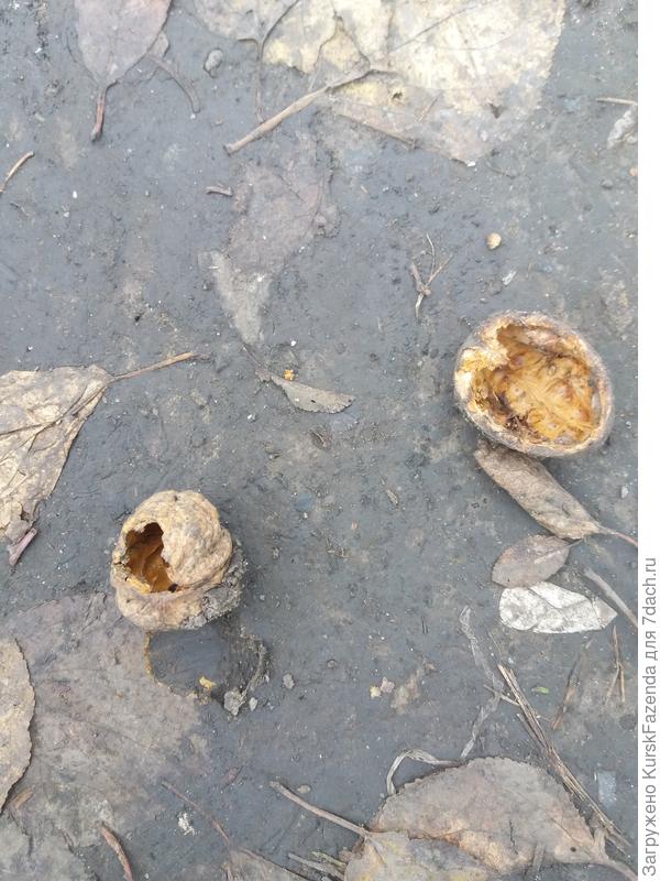 Снизу дядькины орехи, найденные мной под деревом. А сверху орехи, которые оставили грачи.