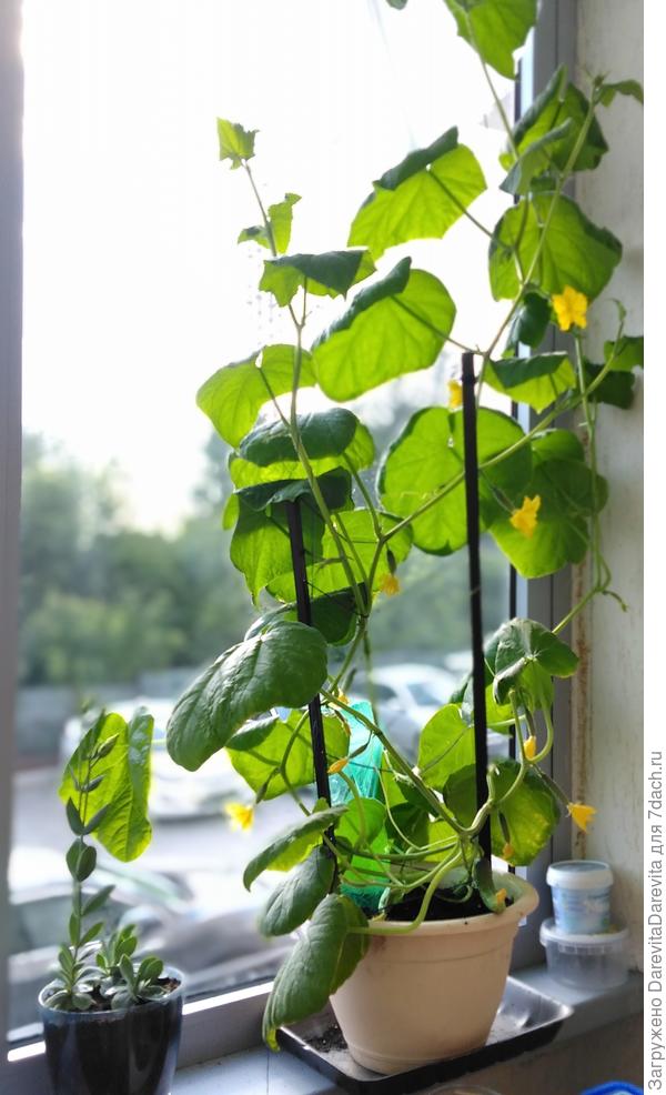 Пожалуйста, подскажите, что с огурцом на балконе — болезнь или не хватает чего-то? Огурец стоит под лампой, листья мелкие, хрупкие, с краёв подсыхают, завязи тоже усыхают, цветки все женского типа...