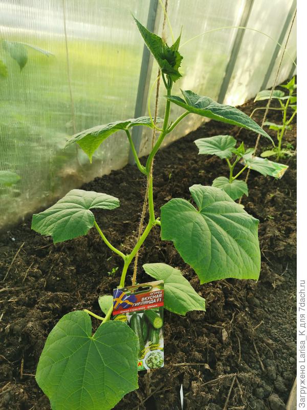 Самый активный рост у гибрида Вкусная гирлянда. К 16 мая у него уже 7-8 настоящих листиков и даже появились первые зачатки будущих огурчиков.