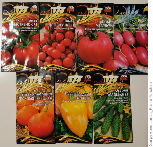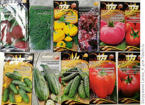 Набор семян, выбранный мной для тестирования: три сорта томатов, перец, огурцы, редис и тыква.
