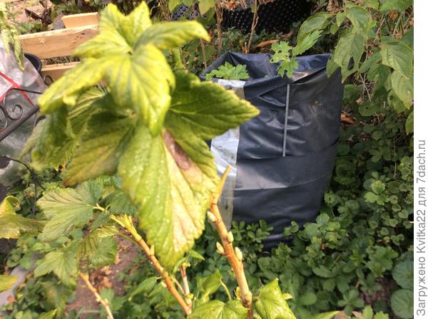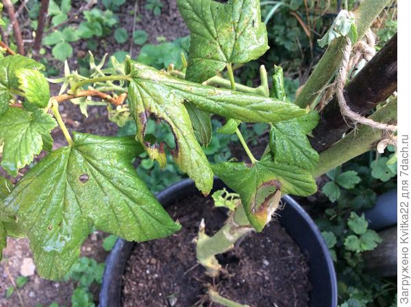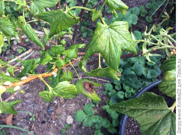 И что самое обидное, эта картина наблюдалась опять и на еще одной новой смородине — белой Баяне, купленной в питомнике Росток весной 2018 года и посаженной далеко от других, и тоже проявилось с конца июня:-(