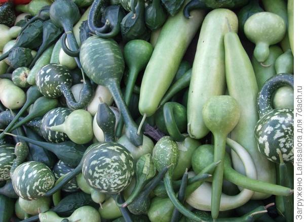 Настоящей “королевой огородных грядок” в этом семействе принято считать лагенарию – посудную тыкву. Ее тыквины поражают крупными размерами и причудливыми формами: змеевидными, шаровидными, кувшиновидными, булавовидными. Не случайно в Китае посудная тыква считалась «царицей растений». В саду китайского императора даже имелся специальный огород для выращивания таких тыкв, шедших на изготовление чаш, из которых император угощал особо отличившихся сановников. Древние римляне делали из нее различные сосуды и даже винные бочки. Римляне очень любили придавать лагенарии самые оригинальные конфигурации, для чего ее плоды выращивали в специальных деревянных формах, которые снимали после созревания.