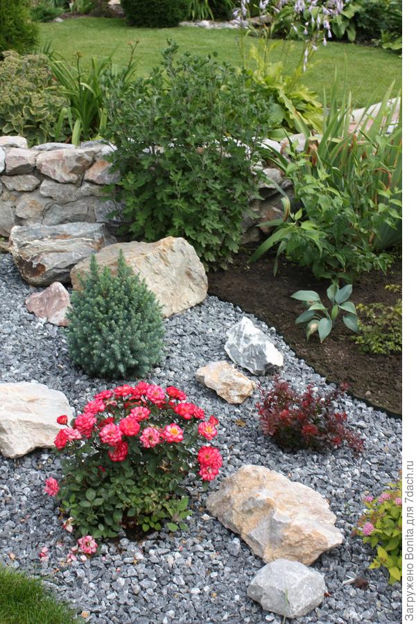 Если все таки вы решитесь на это мероприятие, тогда однозначно оставить пристволовые круги вокруг роз без подсыпки (мульча из коры), и я бы «утяжелила» основные границы клумбы, например брусчаткой.