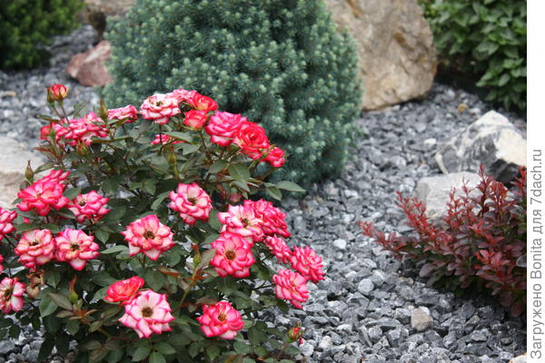 В вопросе еще спрашивали про минусы, поэтому добавлю еще, что и все листопадные растения будут сорничать листвой. В том числе и розы. Проще, если это розы на срезку. Но, мне кажется, что сейчас уже мало кто выращивают такие, т.к. всем хочется большей декоративности и длительного цветения. Моя роза самоочищающая, у нее облетают цветы после цветения. С одной стороны это плюс, но с другой, лепестки — это сор, который заморочно убирать с каменной отсыпки. И это органика, которая забивает постепенно щебень, со временем начнут сеяться сорняки. Рядом с розочкой у меня рос барбарис Тунберга Атропурпуреа Нана — карликовый симпатичный подушкообразный бордового цвета, очень хорошо гармонировал с цветами и молодыми побегами и листочками розы. Но очень много листвы с него по осени сыпалось, а убрать её вручную нереально.