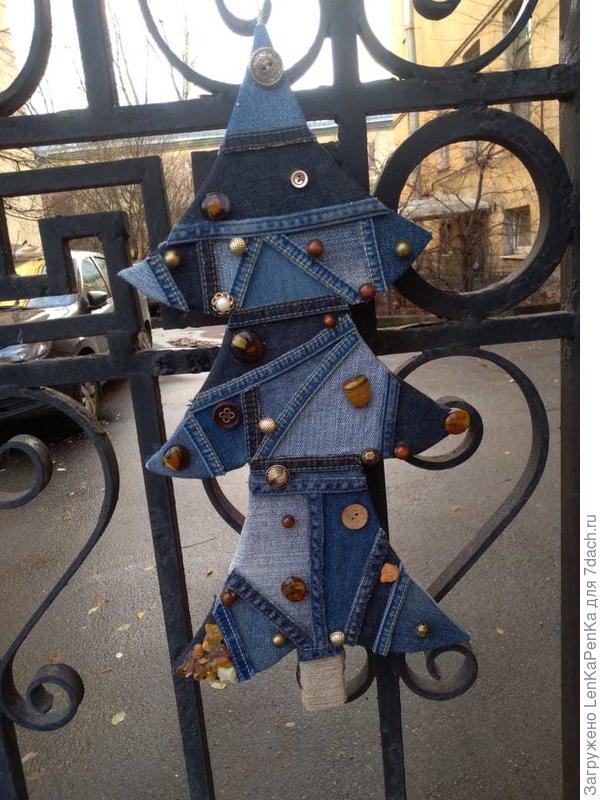 У меня даже затесался один плавник от рыбины (при шитье он затерялся, а теперь очень кстати нашелся). Срезанные джинсовые швы тоже пошли в ход, теперь это гирлянды, которые очень замечательно закрыли стыки. Осталось украсить, для этого клеим бусины и пуговицы, ну и продеваем петельку из шпагата.