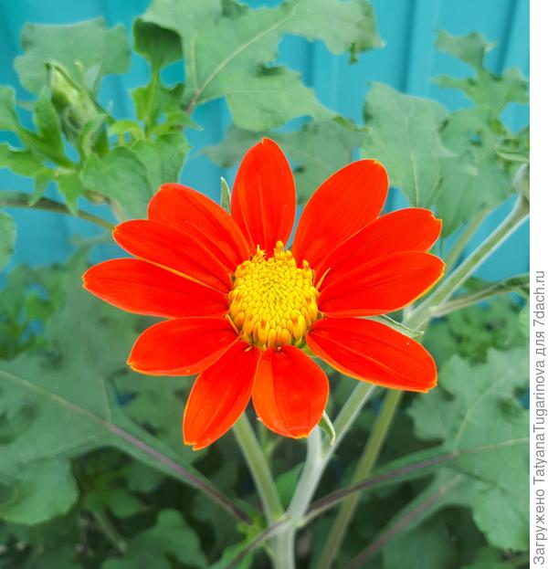Даже до цветения растения смотрелись привлекательно. А когда во второй половине июля раскрылись красновато-оранжевые цветы (диаметром примерно 8 сантиметров), скучный уголок полностью преобразился. На фоне сарая, выкрашенного в ярко-голубой цвет, лепестки выделялись особенно контрастно. Разумеется, красавица титония была бы достойна и более почетного места в парадной зоне участка. Полутора метров она в высоту не достигла, но примерно 1,2-1,3 м — тоже отличный результат.