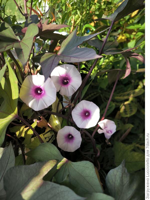 … а «Тата-Кото», несмотря на заминку с каким-то вредителем, цвел роскошно, долго и даже выдал пару коробочек с семенами, что, как я вычитала, редкость (результат нетипичного для батата самоопыления). Семена проращивать пока не пробовала. Цветы у «Тата-Кото» очень нежные, замечательно смотрятся в декоративной листве, пусть и живут только один день.