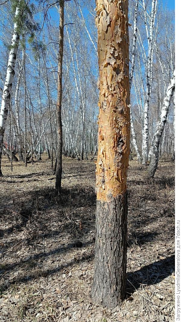 Очень высокая стройная сосна в березовом лесу. Верх ствола светлый, чешуйчатый, от основания — метровый слой жесткой коры