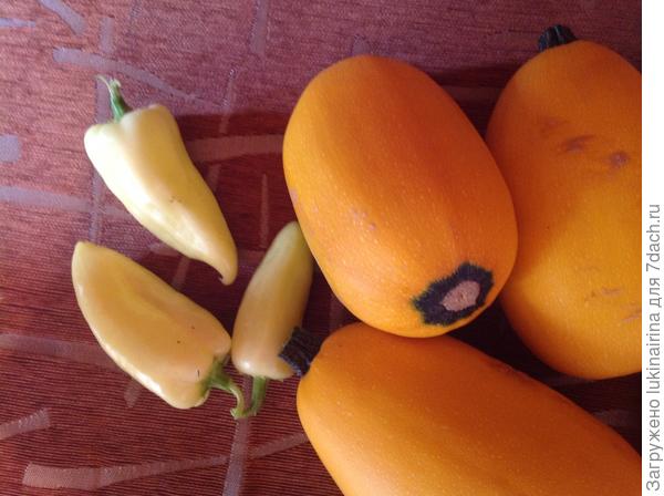 Вот и получается, что лучшие из кабачков-спагетти — это белоплодный и «Равиоло». На фото кустовой «Любимчик» слева, именно такой растет на плети «Равиоло», пакетик от семян у меня не сохранился.