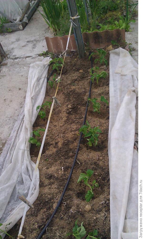 Вам хорошо — вы п р и т е н я е т е, а мы от холода закрывем. А шифер у вас так называемый мягкий? БУ или специально покупали? Вообще — все по уму, аккуратно да еще с капельным поливом. Мы тоже весной купили, хотим в теплице на томатах попробовать, но еще не успели установить.