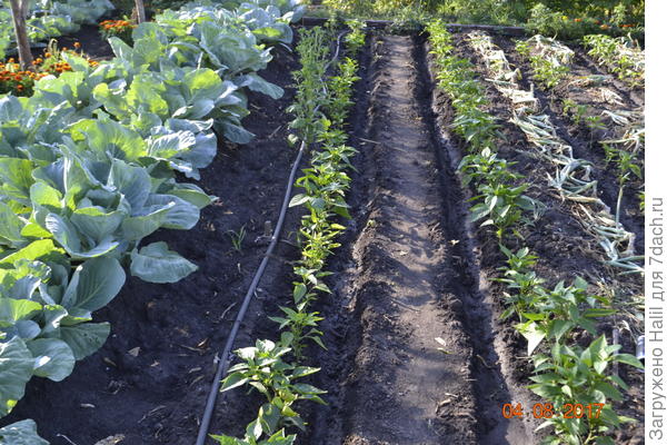 Посажен чеснок и лук, замульчирован навозом-перегноем.Светлый ряд посыпан навоз, темнее навоз-перегной.Весной в светлый ряд высажу рассаду помидор и болгарского перца.