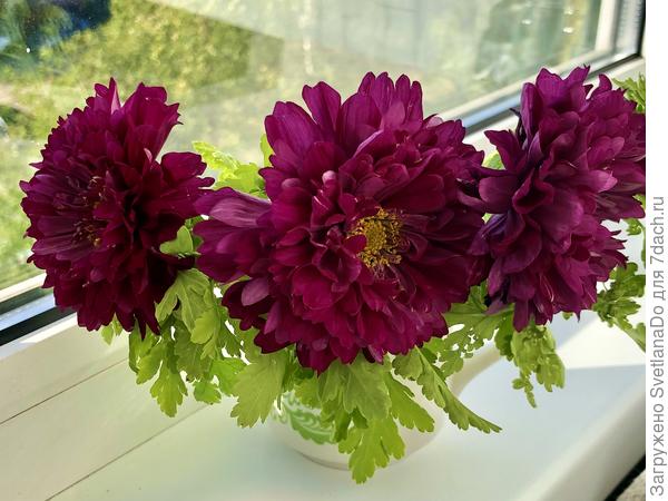 Однолетнее травянистое растение с густоветвистыми прямостоячими стеблями, высотой 80 см. Листья ажурные, рассечены на нитевидные доли. (!!!!) Соцветия бордовые, махровые, изящные, крупные, диаметром 7 см..."