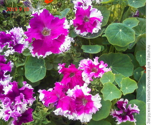 Не меньше впечатляет и махровый 'Водопад красок' F1 от «Плазменных семян». Не только формой цветка или его размером (10-13 см в диаметре), но и формой куста. Все махровые петунии, которые я когда-либо выращивала, были кустовыми, а 'Водопад' — каскадный гибрид!