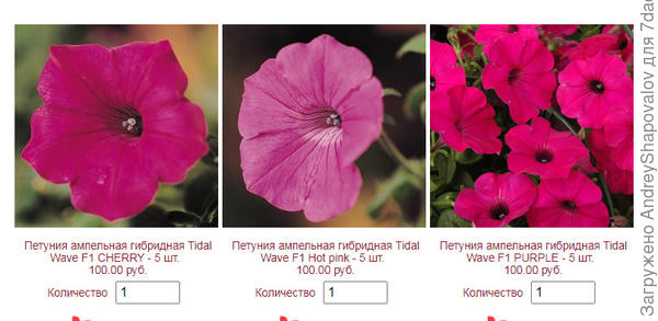 Петунии 'Прилив ('Tidal wave') Красный' F1 и 'Шок Вейв Блю Джинс' F1, фото с сайта seedspost.ru