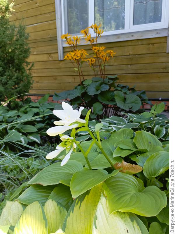 А первой зацветает дицентра, она как раз перед бузульником, и цветет очень долго. Также мне нравится, как темные листья бузульника подсвечивают хосты, они тоже все разные по расцветке и «жирные» тут — в этом не солнечном безветренном углу им всего хватает… Сейчас, кстати, повторно зацвели хосты с обалденно пахнущими белыми цветами, все в разных местах, но с цветущим бузульником смотрятся лучше всех🙂