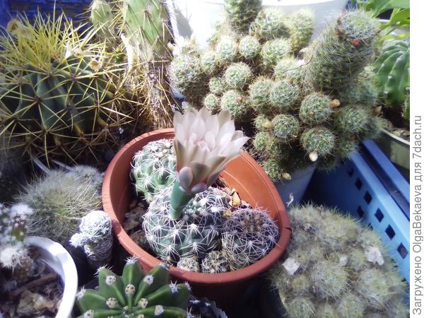 Вот нашла летнее фото, четкое! Посередине цветущий гимнокалициум, чуть выше и справа — как раз мимиллярия Вильда, видны бутоны. Выше слева Эхинокактус Грузона, а ниже слева виден кусок эхинопсиса.