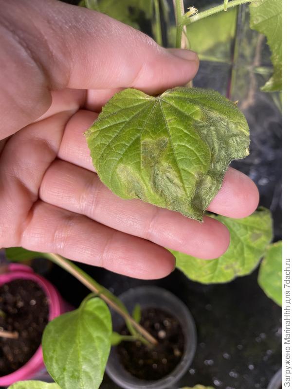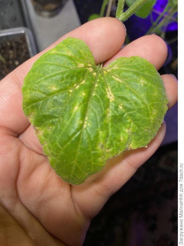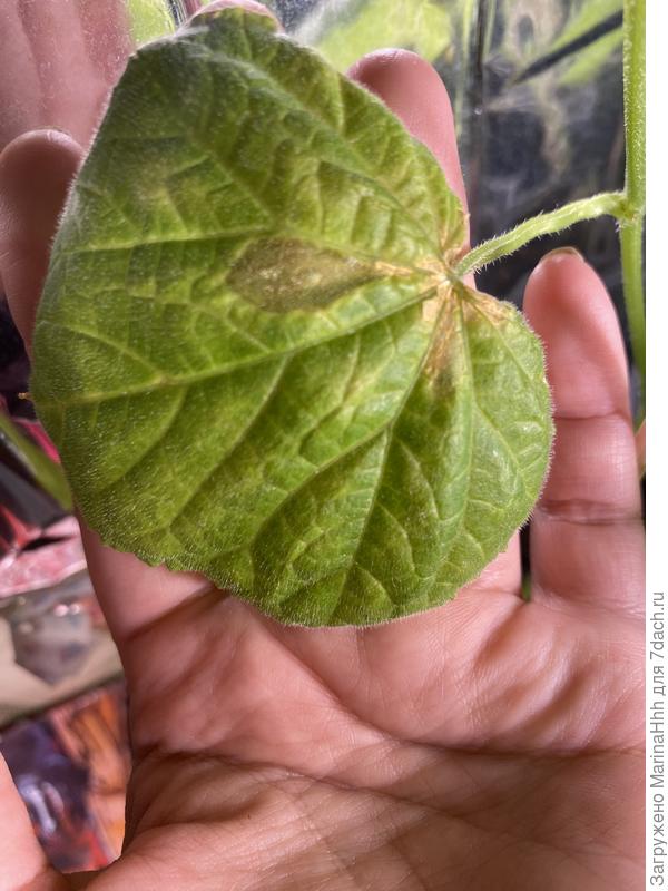 Лист огурца светлеет. Вроде рос хорошо, сейчас вот такой край у листа. Подскажите, что сделать, пожалуйста.