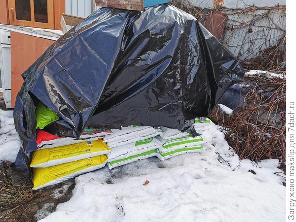 Четыре 50л мешка — Жирнозем, пять 40л мешков Волшебная грядка, 20 40л мешков кислого торфа для посадки голубики, еще несколько мешков биогумуса для теплицы.