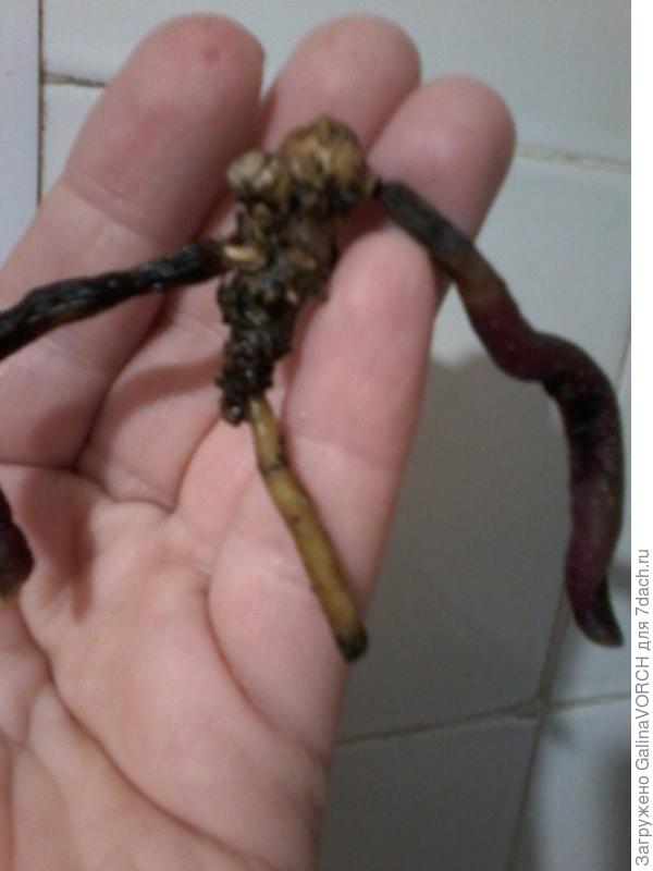 Есть еще один заморыш, эту орхидейку мне отдали в таком вот виде. В октябре посадила ее, так же поливала и подкармливала, сегодня вытащила; два корешка крайних подгнили, срезала, поставила в воду с корневином на два часа, что дальше делать с ней — не знаю. Выбросить жалко; читала, орхидеи живучие, может, выживет?