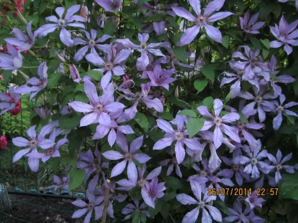 Вообще это один из самых популярных клематисов. Долго-долго цветёт, начинает цвести в июне) Его особенность в том, что только что расцветшие цветы сине-фиолетовые, а потом они понемногу выцветают и становятся голубыми. И получается, что на кустах цветы немного разного отттенка — новые немного с фиолетовинкой, а «старые» — без фиолетовинки)))