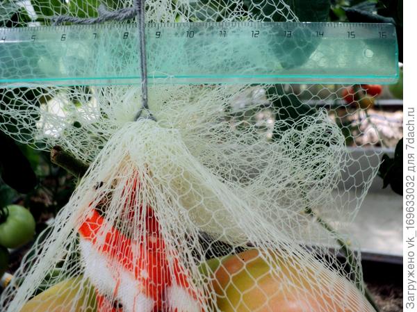 Этот помидор я оставила один на кусте, из сетки сделала мешок и подвязала его к веревке, которой обвит куст. С крупными помидорами есть еще «Яркая малиновка» и «Малиновый рай». Сами кусты — деревья высотой более 2 метров.