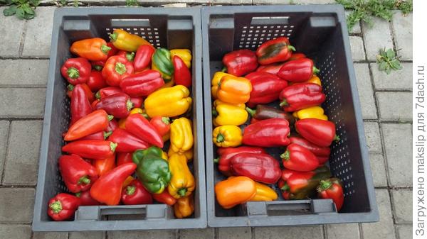 Суть фото банальна. Из теплицы несли два ящика перца для приготовления лечо. Левый несла жена, ну а правый я, как и водится. Она складывала перцы как попало, а я рядами. Вот и все!