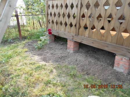 Дело в том, что как мы ни пытались выровнять наш участок, все равно небольшой уклон остался. И это стало видно, когда нам построили баню. Дальний её край стоит практически на земле, а передний, где терраса, поднят над уровнем грунта почти на полметра. Вот и захотелось мне, с одной стороны, прикрыть эти кирпичные «стаканы», на которых стоит наша баня, а с другой — сотворить очередную красоту. Ну а если мне что-то придет в голову, не обращая внимание на время (а час был уже поздний, вечер на дворе), я тут же начинаю воплощать! Не, ну а чë? Зачем откладывать на утро то, что можно сделать вечером?