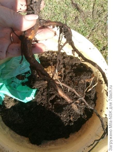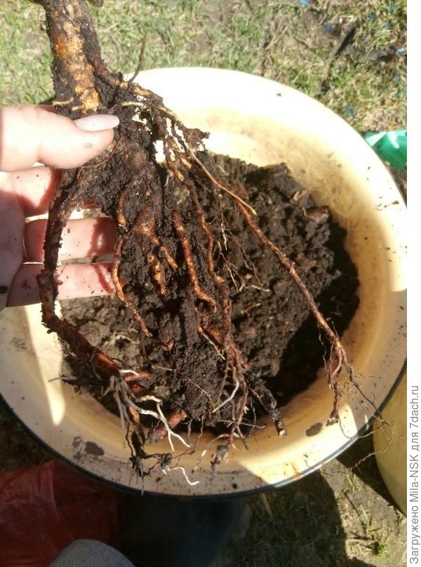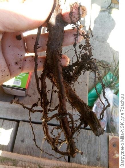 Аккуратно освободила розочку из земляного кома и вот они — беленькие молоденькие корешочки.