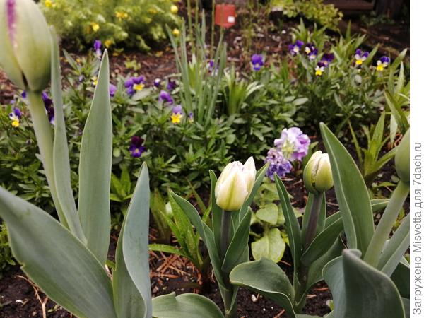За тюльпаном, чуть правее, видны остатки гортензии древовидной. Три года цвела, а из этой зимы не вышла.(