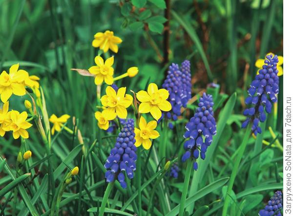 Воздух напоен медовым ароматом цветков мускари армянского (Muscari armeniacum) и дурманящим запахом нарцисса жонкилля (Narcissus jonquilla) ‘Baby Moon‘. Роскошный «парфюмерный» дуэт!