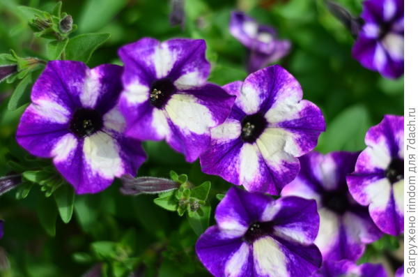 С петунией с темными полосками на цветках идеально сочетаются темные листья декоративных растений, например батата ‘Purple’ или темно-красного пеннисетума ‘Rubrum’. Не менее выигрышно смотрятся скомбинированные друг с другом цветущие калибрахоа и петунии.