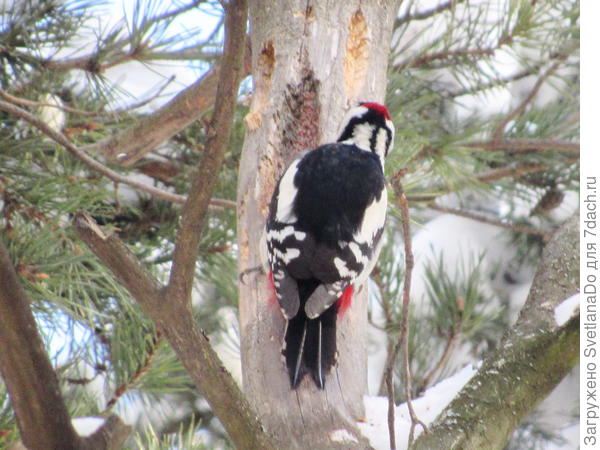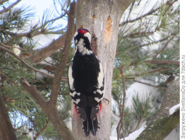 Хотя и седой тоже больше обшаривает деревья, не утруждая себя раздалбливанием древесины. Он куда осторожней большого пестрого, но вместе с тем я часто вижу его за обследованием построек, до чего БПД не опускается.