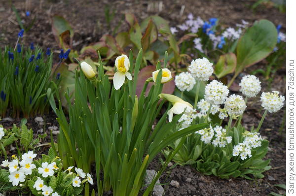Всё, что там «поднимается» после примул и мелколуковичных, «поднимается» вместе с хостами, не раньше.