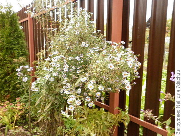 моя разрасталась за счёт ползучих корешков, корневая у неё поверхностная, горизонтальная, на фото плохо видно листочки, но я сравнила с фото из интернета, это точно виргинская астра, или новобельгийская, высота кута была примерно 1,50м
